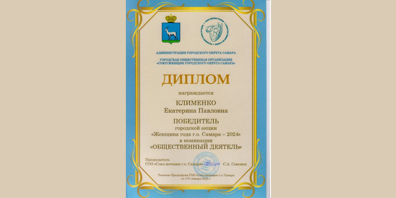 Победителем городской акции «Женщина года г.о. Самара -2024 г.» в номинации «Общественная деятельность» стала председатель правления Самарской городской общественной организации инвалидов-больных рассеянным склерозом Екатерина Клименко.