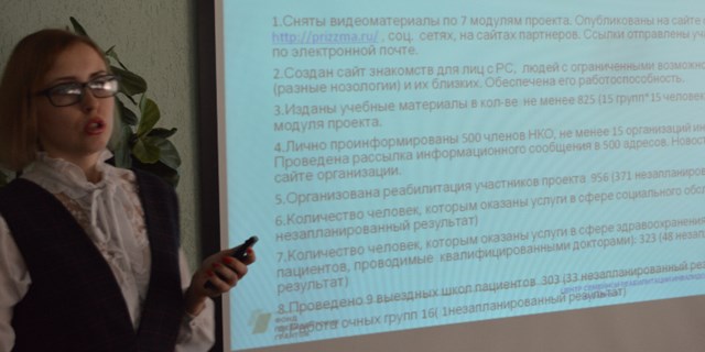 В ходе мероприятия участникам круглого стола была представлена итоговая презентация проекта, осветившая сведения о команде проекта, основных направлениях деятельности в рамках проекта, целях и задачах, затронут вопрос действий, осуществленных для комплексной реабилитации участников. Подробно раскрылся формат занятий в рамках каждого из семи модулей проекта, сведения о сплочении коллектива, просветительских школах пациентов с участием докторов СОКБ им. В.Д. Середавина и Клиник Самарского государственного медицинского университета, выездных школах на базе ГБУ «Самарский», работе с группами надомных реабилитантов Самарской области.