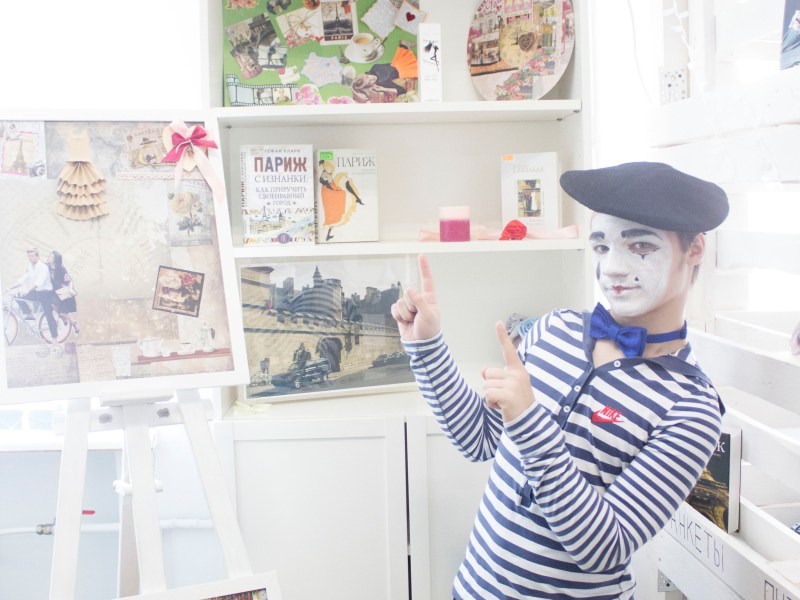 … Вырос в зале настоящий «музей восковых фигур». Экспонаты застыли в ожидании гостей, гости не заставили себя долго ждать, и, сама Екатерина Сизова, начала разглядывать интерактивные фигуры. Фигуры двигались, танцевали, увлекали зрителей на Парижские улицы, где легко прогуливались кокетки с зонтиками, где развлекал горожан кукловод со своими марионетками, где веселил туристов безмолвный мим…. Артисты так вжились в роли, так втянулись в процесс, что финальную фигуру пришлось повторять дважды!