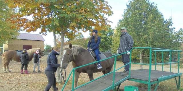 Участники первой группы проекта «Иппотерапия-путь к восстановлению людей с рассеянным склерозом»,реализуемого с использованием средств гранта Президента Российской Федерации на развитие гражданского общества, реабилитируются, развивают свои навыки и умения в области выполнения реабилитирующих упражнений и общения с животным.